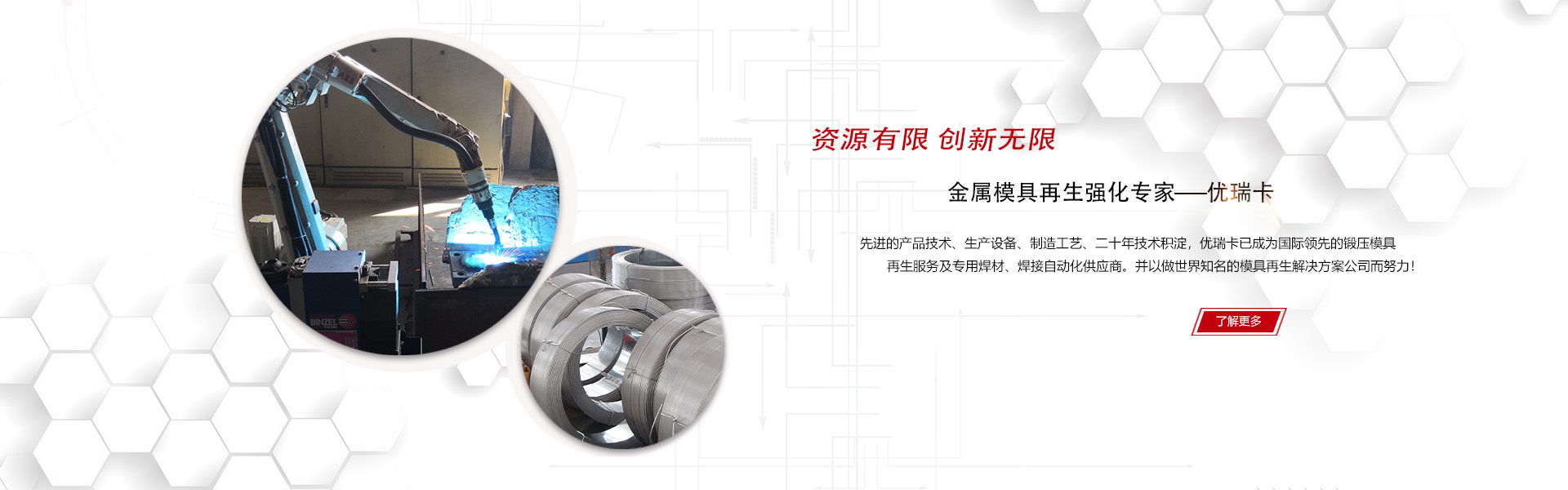 優(yōu)瑞卡是國內(nèi)知名的鍛造模具再生服務(wù)及專用焊材、模具焊接系統(tǒng)供應(yīng)商,我們吸收引用美國、德國、日本等國的先進模具焊修經(jīng)驗,結(jié)合國內(nèi)企業(yè)情況,不斷創(chuàng)新并研發(fā)了更加有效、更加成熟、更易操作的模具再生技術(shù),為廣大企業(yè)在鍛造、沖壓、壓鑄、塑料模具及機械部件維修方面提供優(yōu)質(zhì)的焊接材料、自動化焊接系統(tǒng)、模具加工用刀具和完善的再生修復(fù)服務(wù)。優(yōu)瑞卡正逐漸成為國內(nèi)外鍛造與沖壓企業(yè)創(chuàng)造更大利潤、提升核心競爭力不可或缺的重要推動力!
